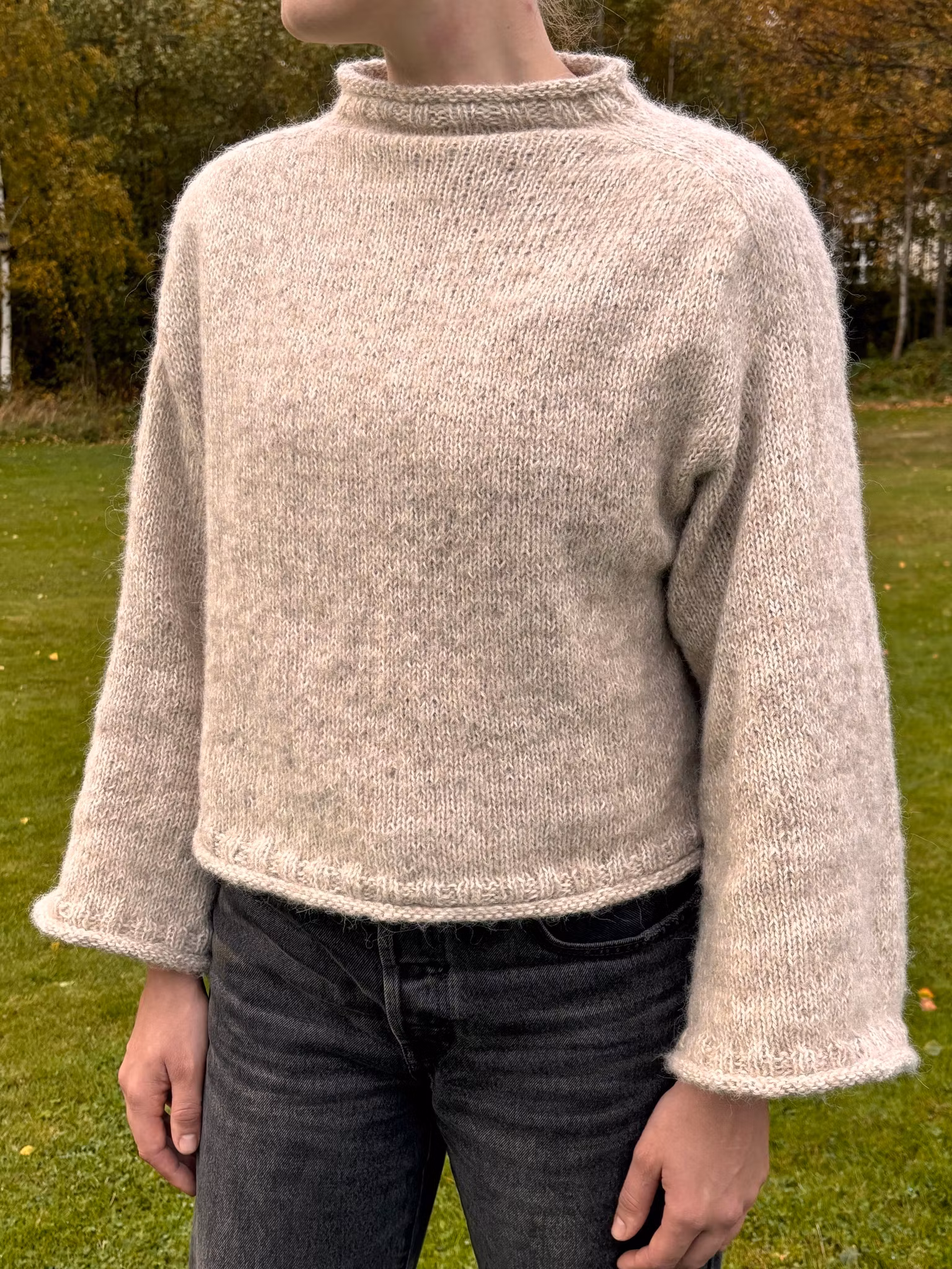 Modellen är lite kortare och något oversize med rullkanter och finns i två storlekar, S/M samt L/XL. Den stickas med två garntrådar, den ena i Hjerte Fine Highland Wool samt Silk Kid Mohair från Hjertegarn. Tillsammans blir det en mjuk, varm och härlig känsla.